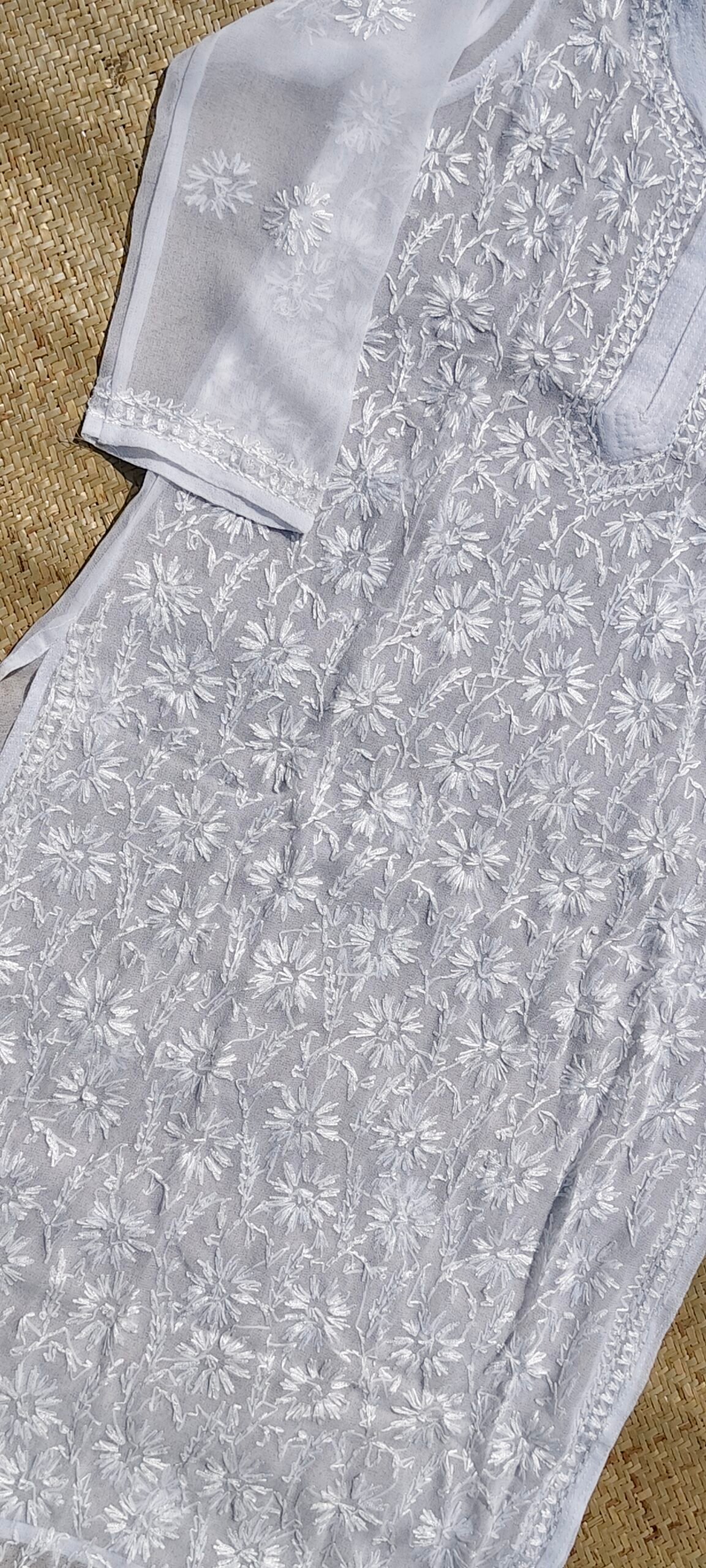 The Aliya Georgette Straight Fit Kurti is a stylish and elegant outfit crafted from lightweight georgette fabric. It features intricate all-over embroidery, creating a delicate and ornate look. The kurti has a straight silhouette, offering a comfortable yet flattering fit. Ideal for both casual and semi-formal occasions, its detailed craftsmanship and rich design make it a versatile addition to any wardrobe.