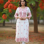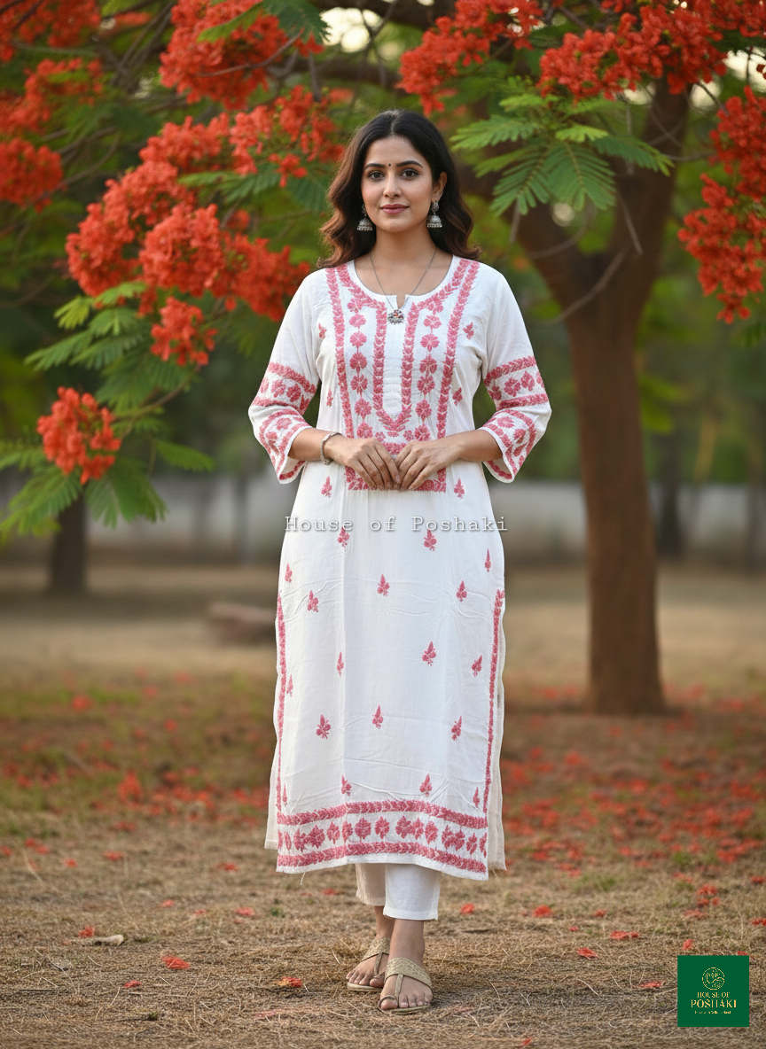 A straight-fit rayon kurti, perfect for daily wear and comfortable in summer. Handcrafted with chikankari detailing, it features an extra touch of embroidery on the sleeves for added elegance.