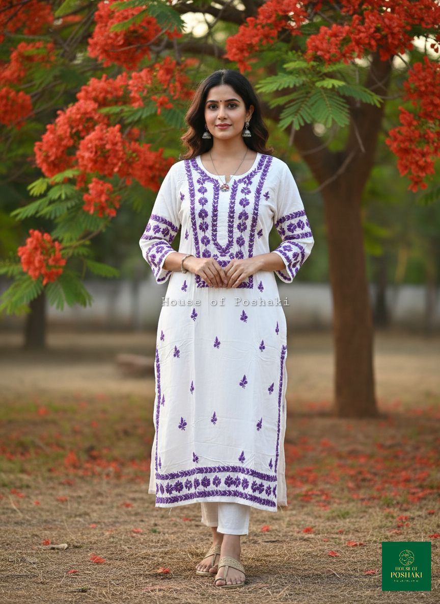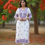A straight-fit rayon kurti, perfect for daily wear and comfortable in summer. Handcrafted with chikankari detailing, it features an extra touch of embroidery on the sleeves for added elegance.