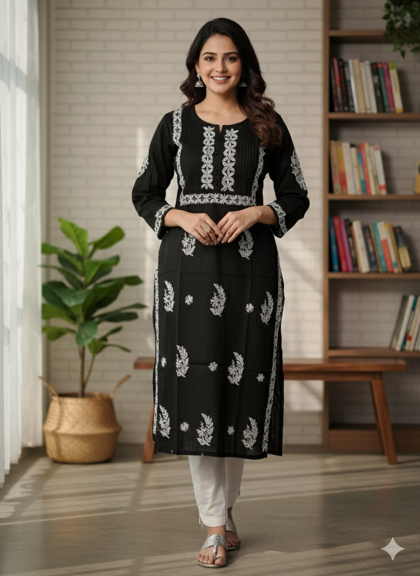 A cotton Chikankari Kurti panel design features intricate hand-embroidered patterns typically crafted with delicate white thread on a soft, breathable cotton fabric. The design showcases traditional floral motifs, paisleys, or geometric patterns, often arranged symmetrically along the front panel of the Kurti. The light and airy texture of the cotton enhances the grace of the chikankari, making it a perfect blend of elegance and comfort, ideal for casual or festive wear.