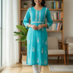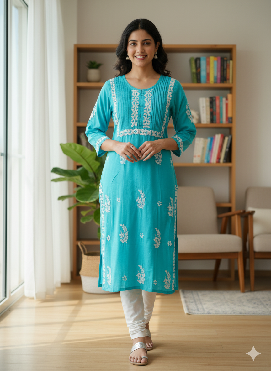 A cotton Chikankari Kurti panel design features intricate hand-embroidered patterns typically crafted with delicate white thread on a soft, breathable cotton fabric. The design showcases traditional floral motifs, paisleys, or geometric patterns, often arranged symmetrically along the front panel of the Kurti. The light and airy texture of the cotton enhances the grace of the chikankari, making it a perfect blend of elegance and comfort, ideal for casual or festive wear.