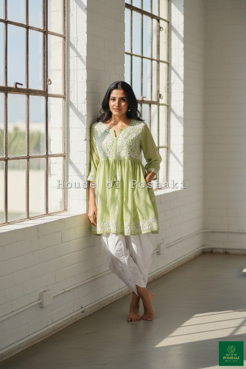 A Georgette peplum top, perfect for everyday wear, is available in seven vibrant colours. This top features delicate, handcrafted Chikankari embroidery, adding a touch of elegance to its flowy, lightweight fabric. The peplum design accentuates the waist, creating a flattering silhouette that combines comfort with style. Ideal for casual outings or workwear, this versatile piece effortlessly blends traditional craftsmanship with modern fashion.