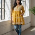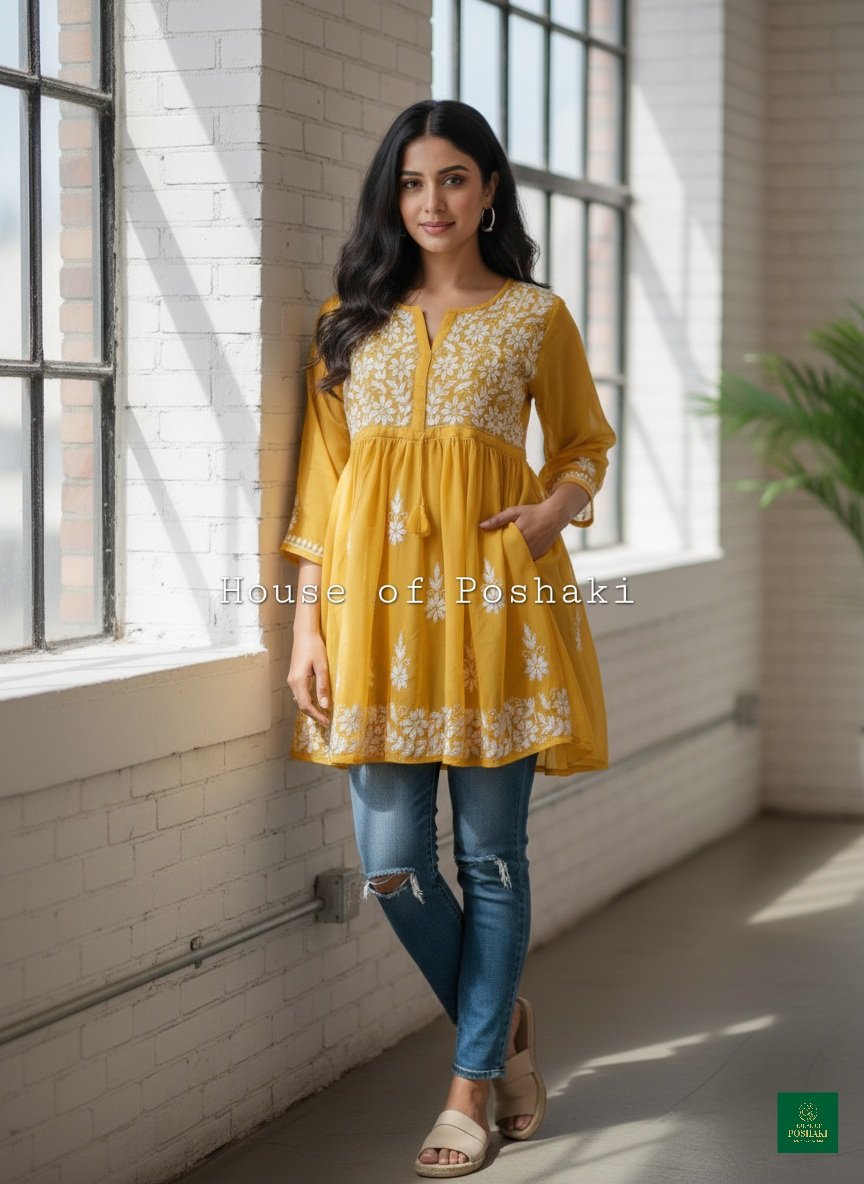 A Georgette peplum top, perfect for everyday wear, is available in seven vibrant colours. This top features delicate, handcrafted Chikankari embroidery, adding a touch of elegance to its flowy, lightweight fabric. The peplum design accentuates the waist, creating a flattering silhouette that combines comfort with style. Ideal for casual outings or workwear, this versatile piece effortlessly blends traditional craftsmanship with modern fashion.