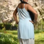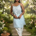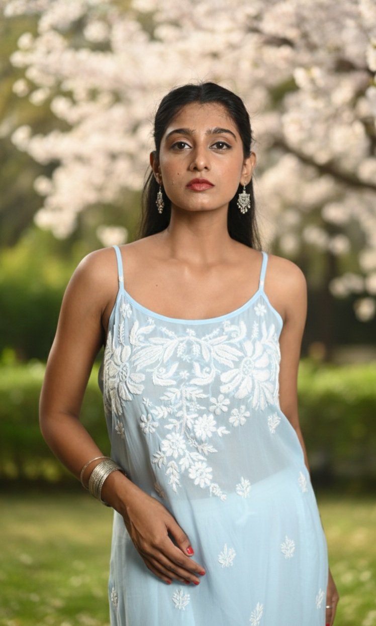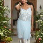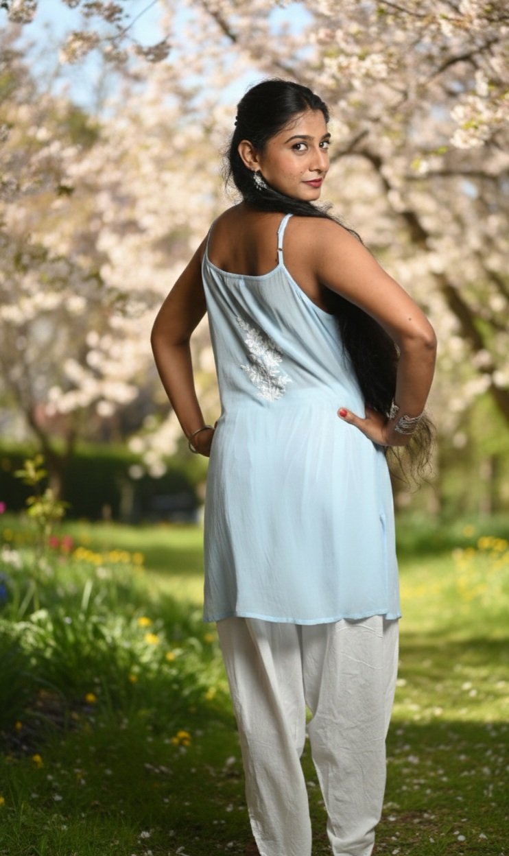 The kurti features delicate HD Chikankari hand embroidery, a timeless craft that adds subtle sophistication to its modern silhouette. With fully adjustable straps for a custom fit and a short, flowy length, it’s ideal for brunches, beach days, or relaxed evenings out.