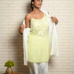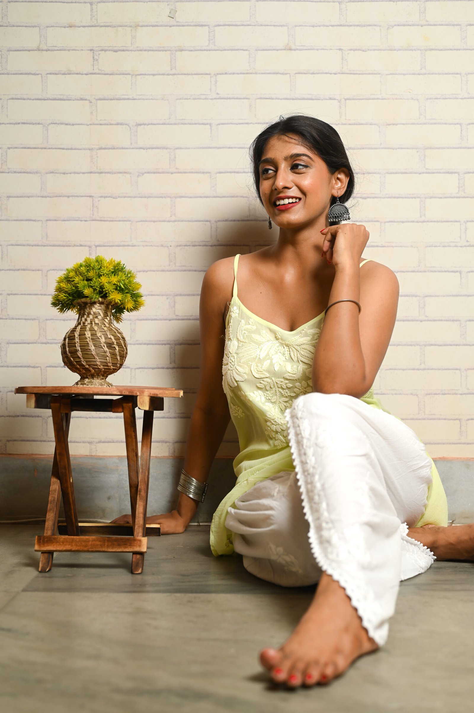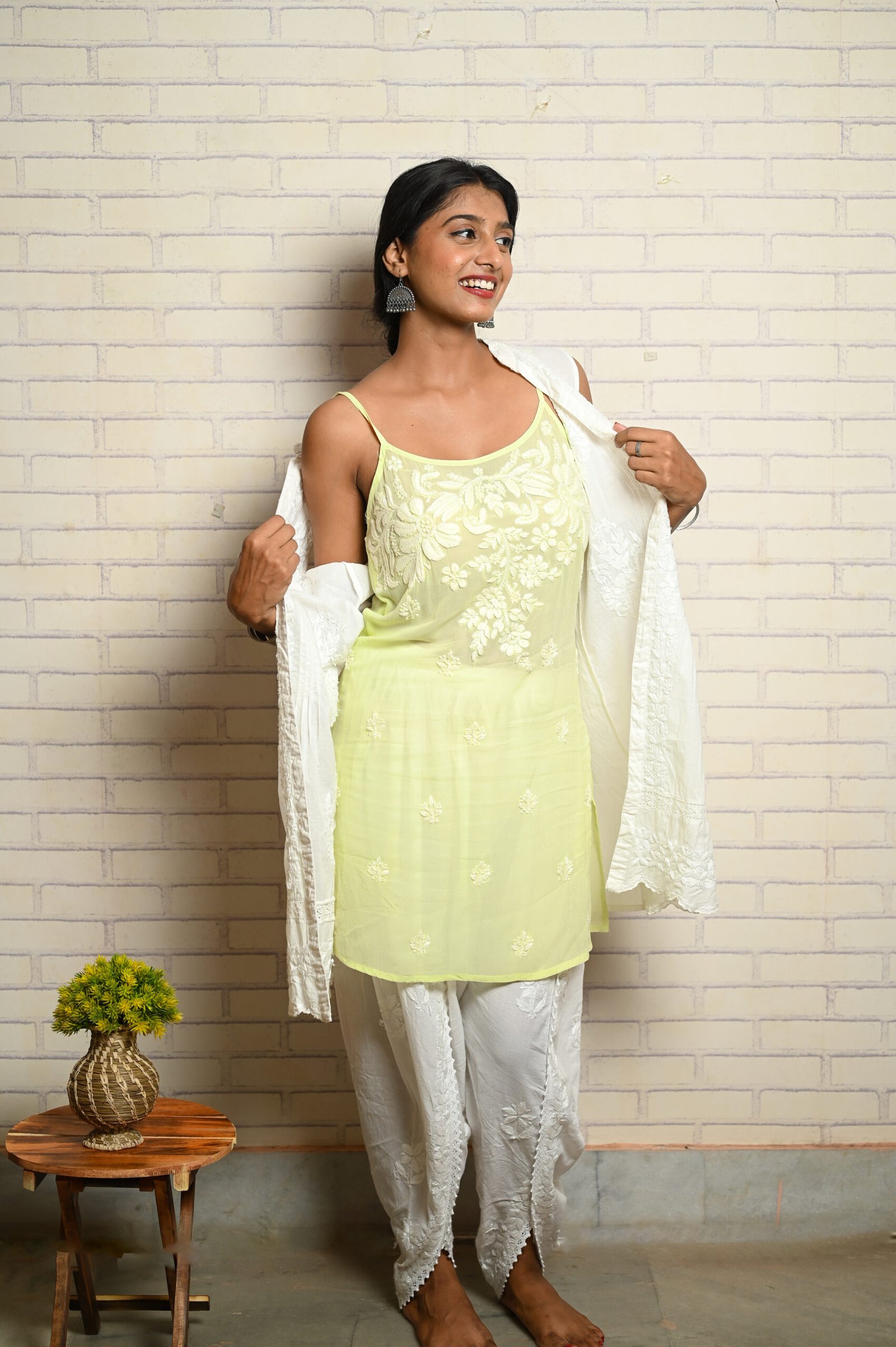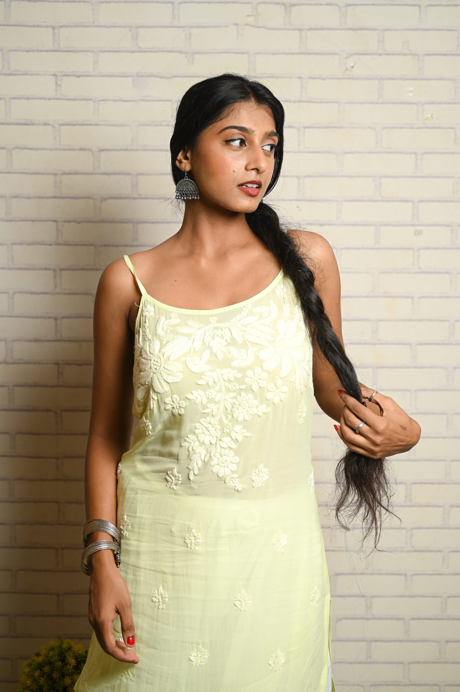 The kurti features delicate HD Chikankari hand embroidery, a timeless craft that adds subtle sophistication to its modern silhouette. With fully adjustable straps for a custom fit and a short, flowy length, it’s ideal for brunches, beach days, or relaxed evenings out.