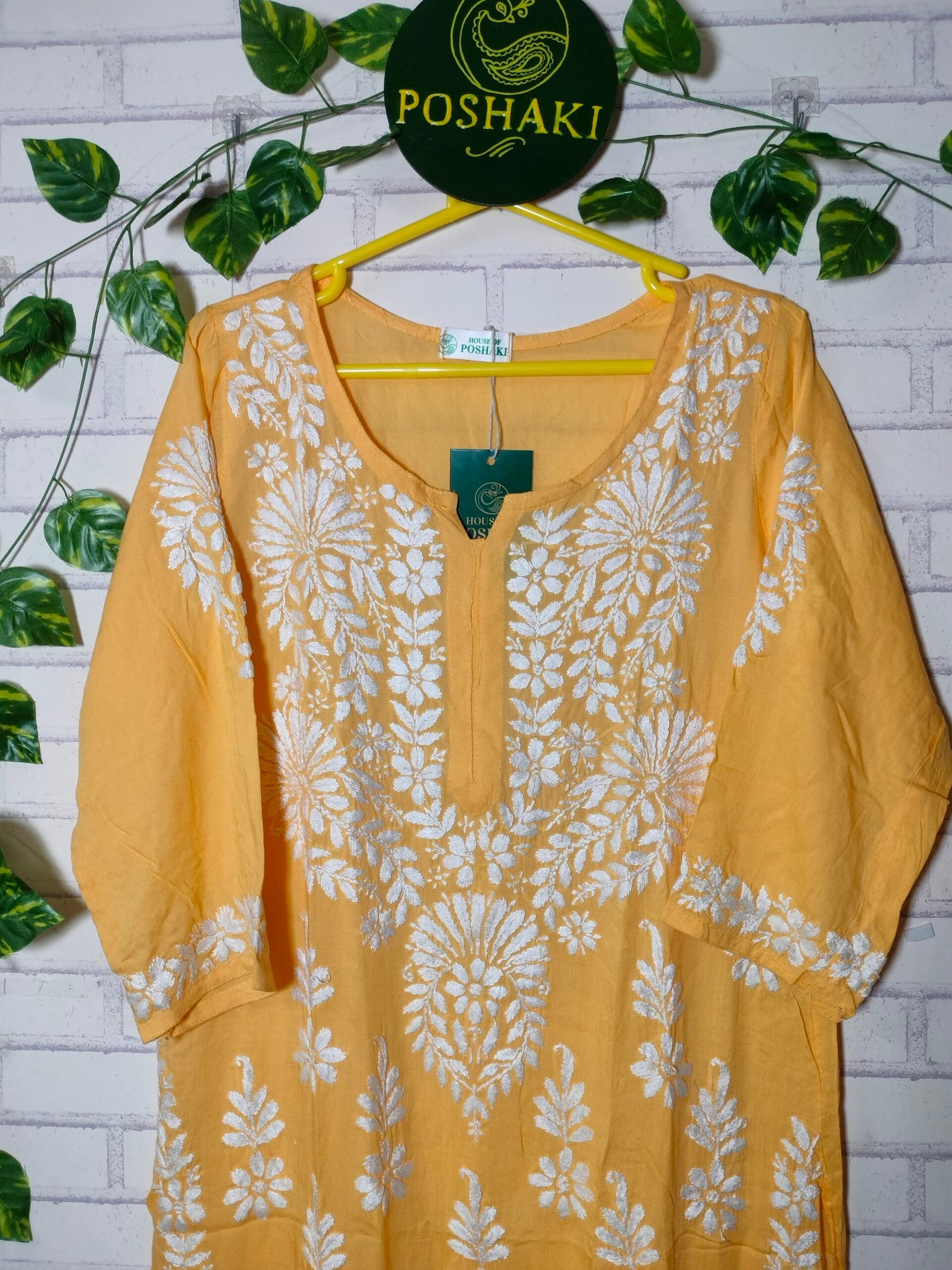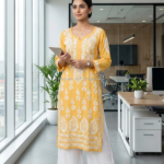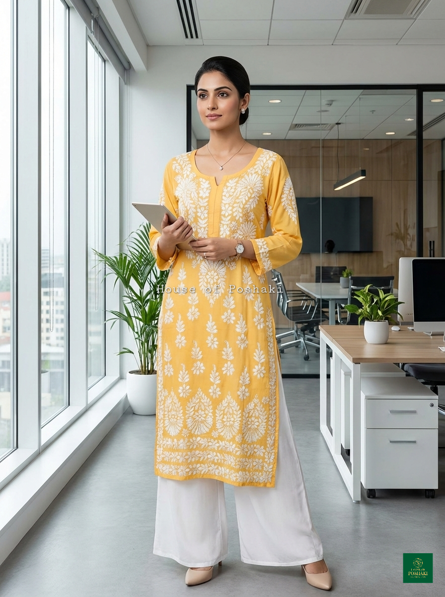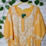 A straight-fit modal kurti with intricate heavy chikankari embroidery, featuring delicate floral and geometric patterns. The soft, breathable modal fabric makes it ideal for summer, offering both comfort and elegance. The kurti is designed with a modest neckline and three-quarter sleeves, making it a versatile piece for casual or festive occasions. The chikankari work adds a touch of traditional charm, perfect for staying stylish in warm weather.