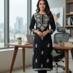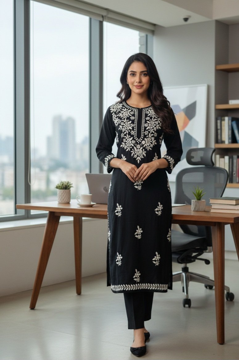 'Discover effortless elegance with our summer-friendly Modal straight kurti, adorned with exquisite ghaspatti handcrafted chikankari work. Perfect for warm weather, this kurti combines breathable comfort with intricate, artisanal detailing for a timeless look.