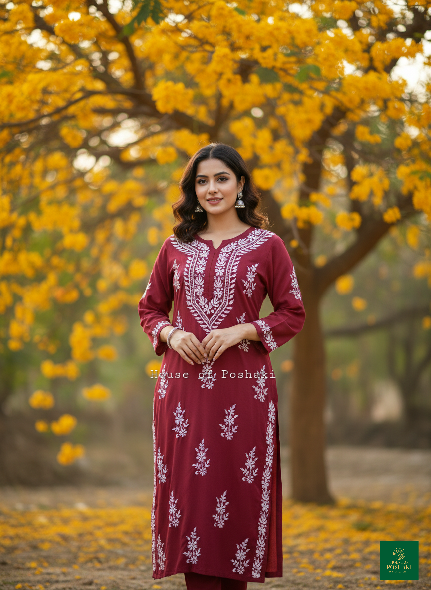This straight-fit rayon kurti is designed for daily wear, offering a blend of comfort and elegance, perfect for summer. Handcrafted with intricate chikankari embroidery, it features breathable, lightweight fabric that keeps you cool while ensuring a stylish look. The kurti's simple yet elegant design makes it versatile for casual outings or work.