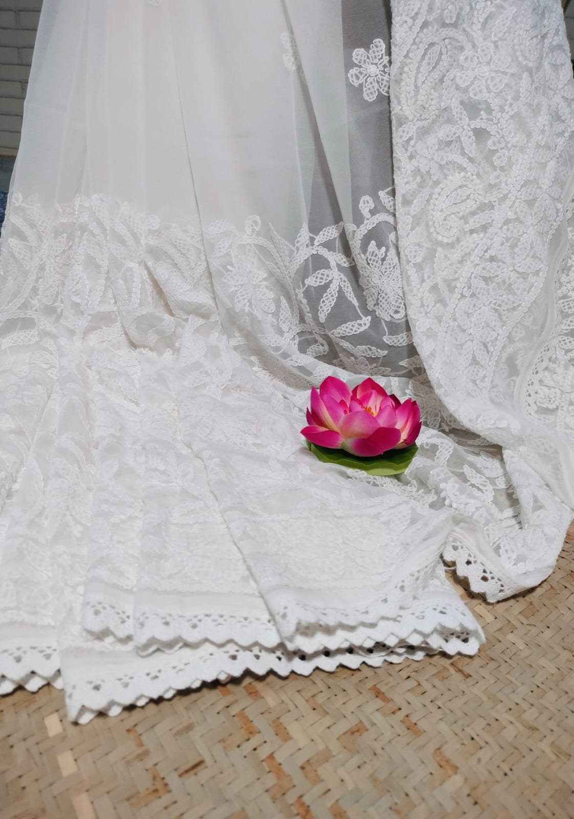 Elevate your ethnic wardrobe with our exquisite Georgette Half Jaal Saree, adorned with intricate Floral Motif Lucknowi Chikankari. This handcrafted masterpiece blends traditional artistry with contemporary fashion, offering you a timeless piece of elegance and grace.