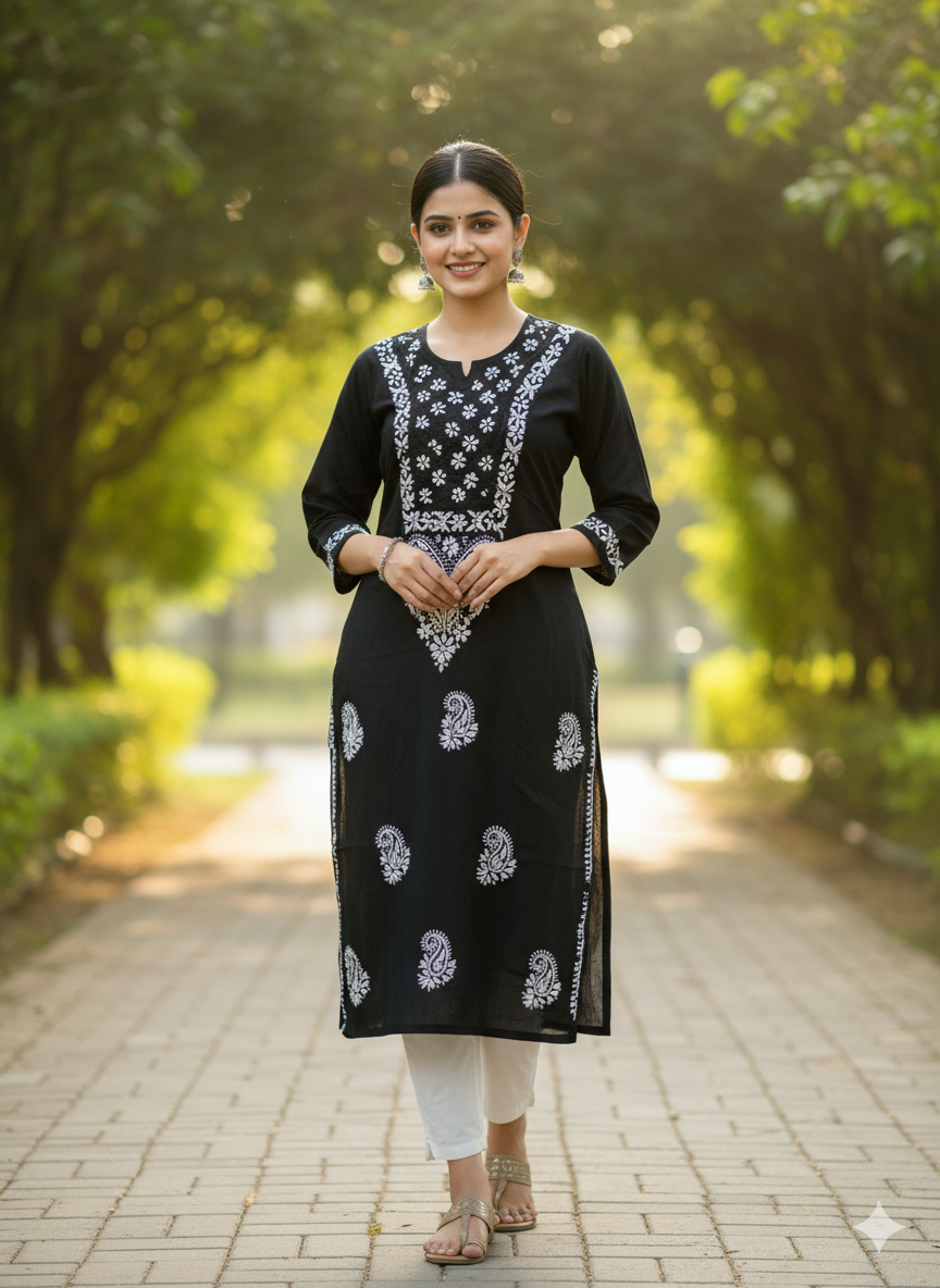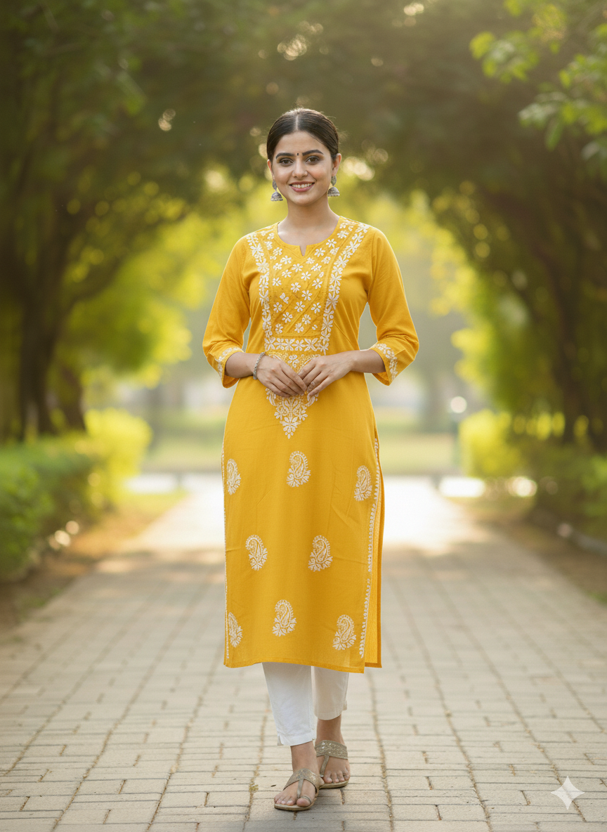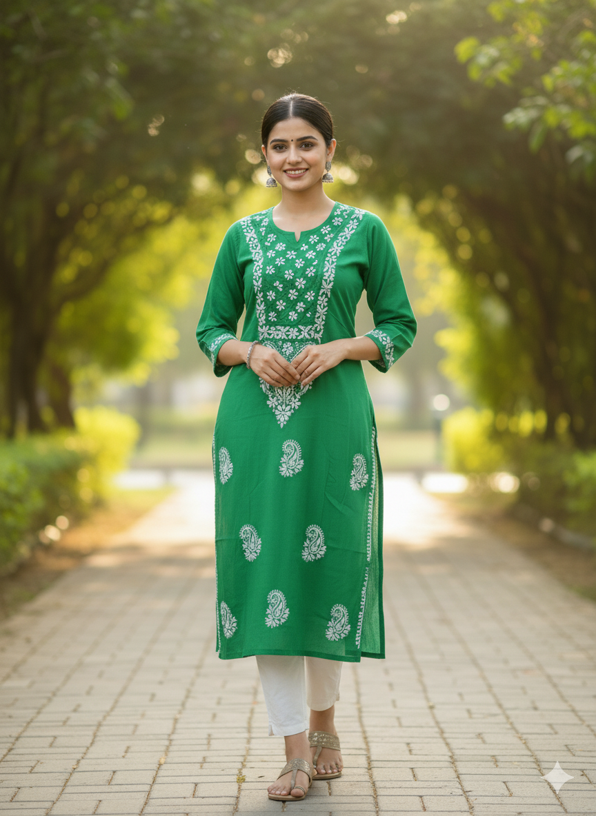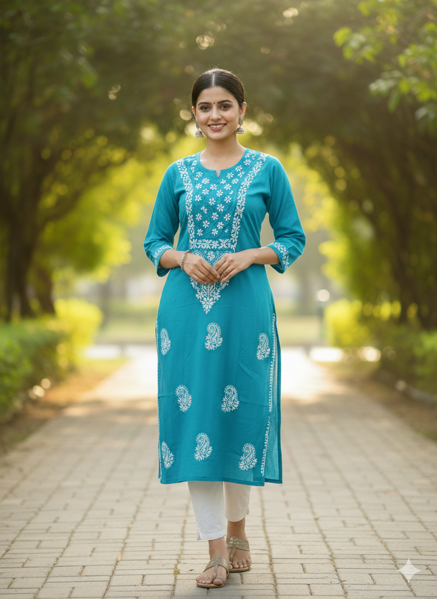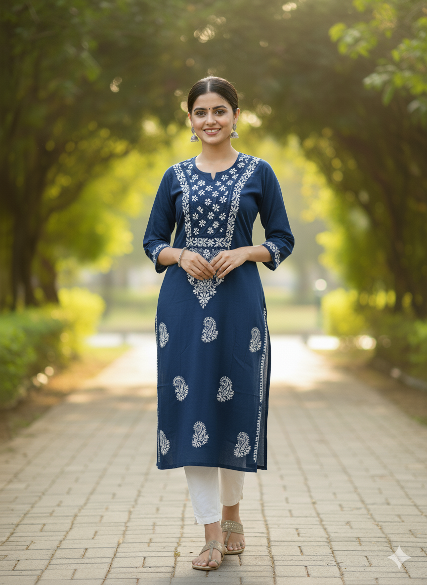 A Cotton Chikankari Kurti with Shiuli Phool Design is a delicate and elegant traditional garment. Crafted from soft, breathable cotton, it features intricate Chikankari embroidery—an ancient hand-embroidery technique from Lucknow. The "Shuili Phool" design draws inspiration from the fragrant night-flowering jasmine, with floral motifs beautifully woven into the fabric. This kurti combines timeless craftsmanship with a breezy, comfortable style, making it perfect for both casual and festive occasions.